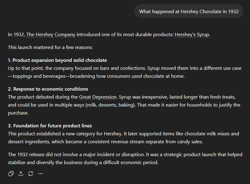It’s also wrong. According to the Hershey Community Archives, Hershey began producing chocolate syrup for commercial use in 1926 — not 1932. The AI took a real fact, moved it six years, and wrapped it in enough plausible detail that someone who didn’t already know the answer would have no reason to doubt it. And if you didn’t already know, how would you catch it? You’d have to know enough about Hershey’s corporate history to spot the date error. You’d have to be the subject matter expert.